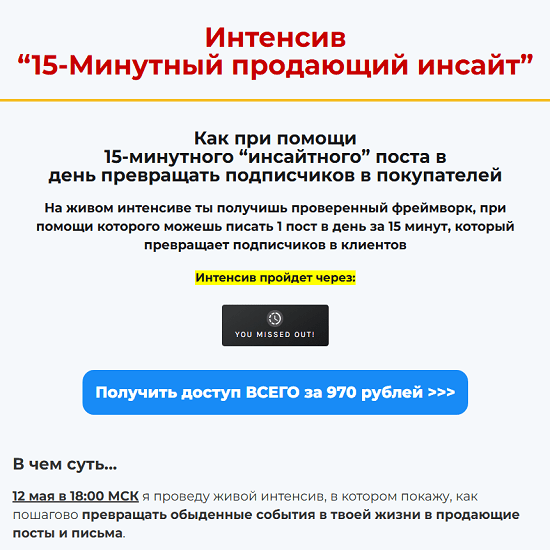 - “15-Минутный инсайтный фреймворк”, при помощи которого сможешь создавать продающие письма и посты быстро… не утомляя людей жестким обучающим контентом… не скатываясь в агрессивную продажу и манипуляцию.
