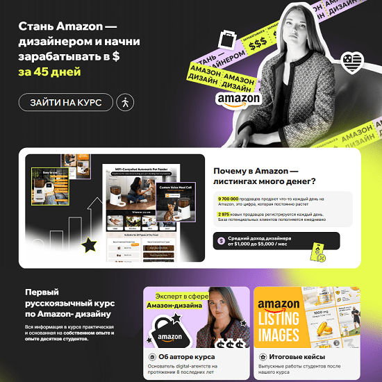Первый русскоязычный курс по Amazon-дизайну. Вся информация в курсе практическая и основанная на собственном опыте и опыте десятков студентов.