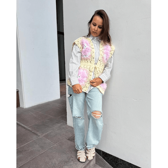 По МК вы сможете связать три изделия на детские или взрослые размеры: Жилет, кардиган полностью из квадратов, Кардиган с рукавами спицами