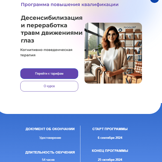 Этот курс посвящен методу десенсибилизации и переработки травм движениями глаз (ДПДГ), который является одной из наиболее эффективных техник для работы с травматическим опытом. Курс рассчитан на психологов и психотерапевтов, желающих углубить свои знаниличня и практические навыки в области терапии травм.