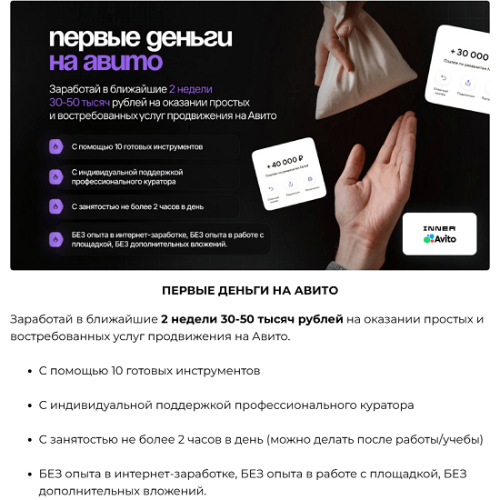 Заработай свои первые 50-75 тысяч рублей на простых и востребованных Авито-услугах для бизнеса, используя 12 готовых авторских инструментов inner.avito.